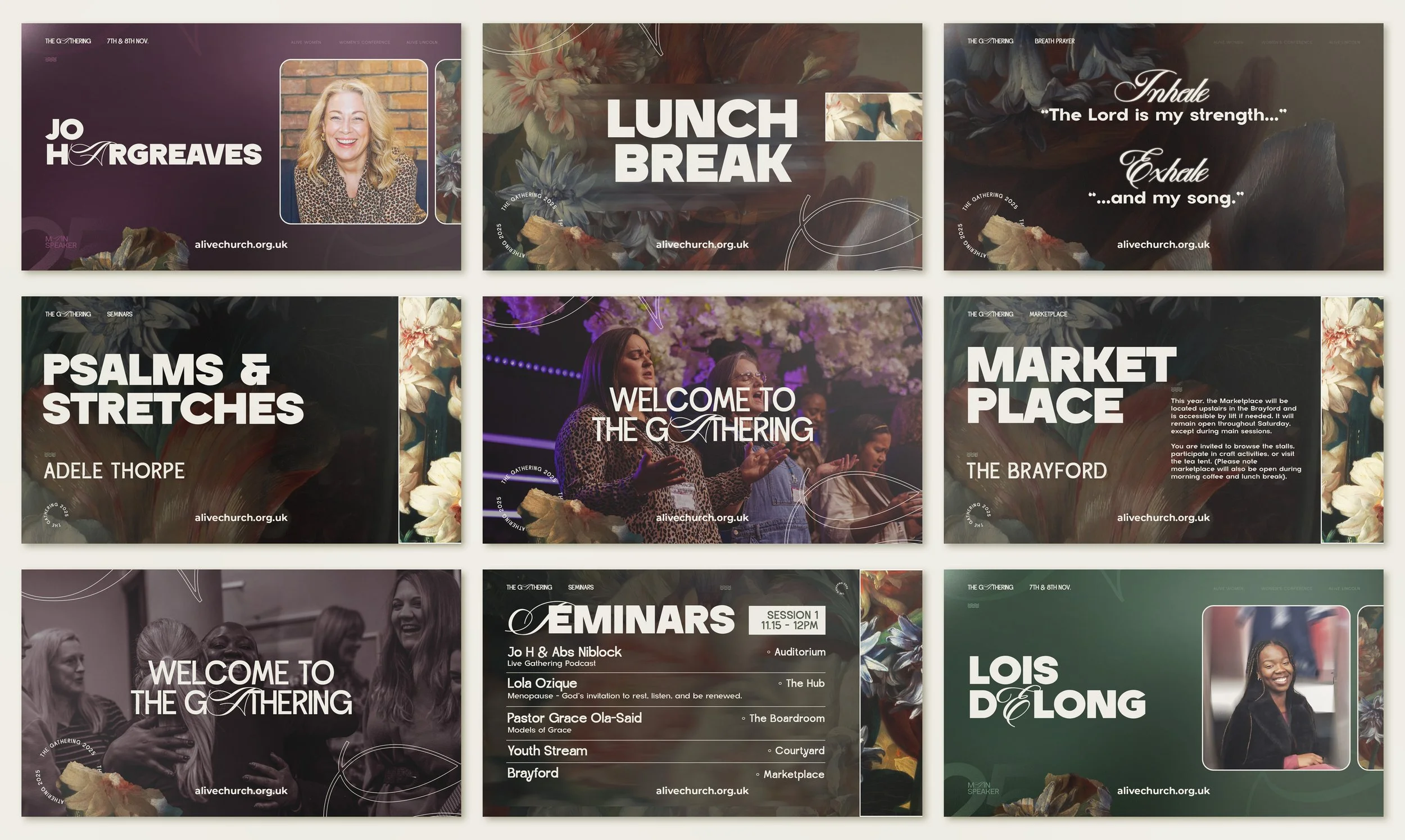 My aim was to stray away from generic themes and colors used in previous years that could typically be used to define “femininity” / “womanhood”. I decided on an approach that held the theme well “He let’s me catch my breathe” but one that could still visually be identified with a women’s gathering. Using deeper tones inspired by regal palettes, font styles and composition as well a floral aesthetic that could still to tie in to previous years.